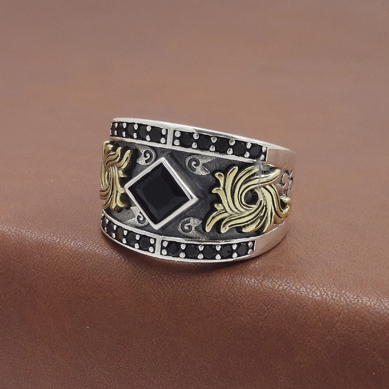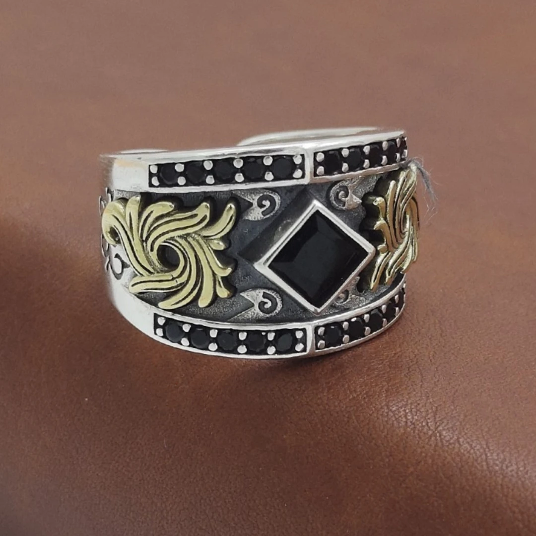 💎 Cette bague homme se distingue par son design audacieux, mettant en valeur une obsidienne noire centrale sertie de motifs en laiton doré et de petits détails en argent. Les gravures délicates et les contrastes de couleurs apportent une touche sophistiquée, faisant de cette bague un choix parfait pour les hommes modernes en quête de distinction et de symbolisme spirituel.