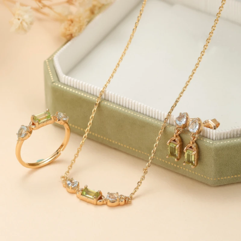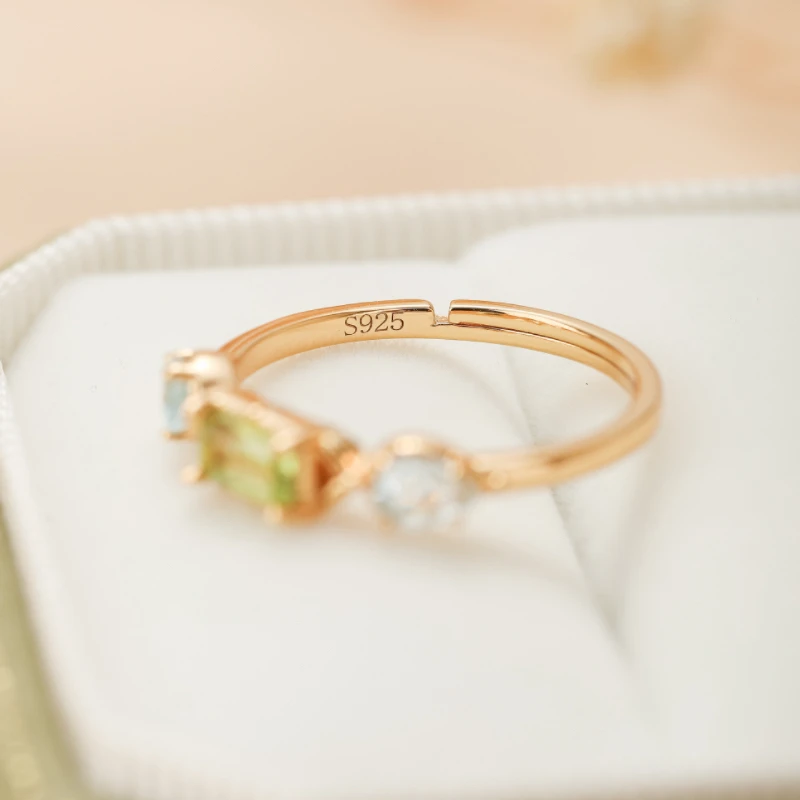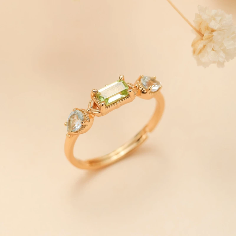 ✨ Son design géométrique raffiné, avec un péridot rectangulaire de 3*5 mm entouré de deux topazes bleues en forme de goutte de 3*4 mm, crée un équilibre parfait entre modernité et sophistication. La taille ajustable assure un confort optimal pour toutes les mains.