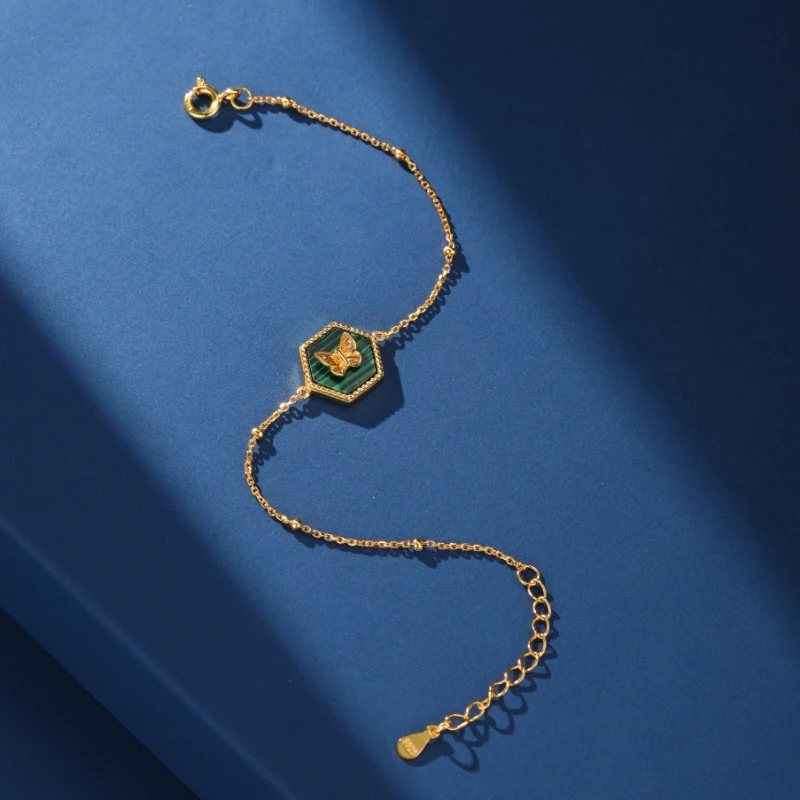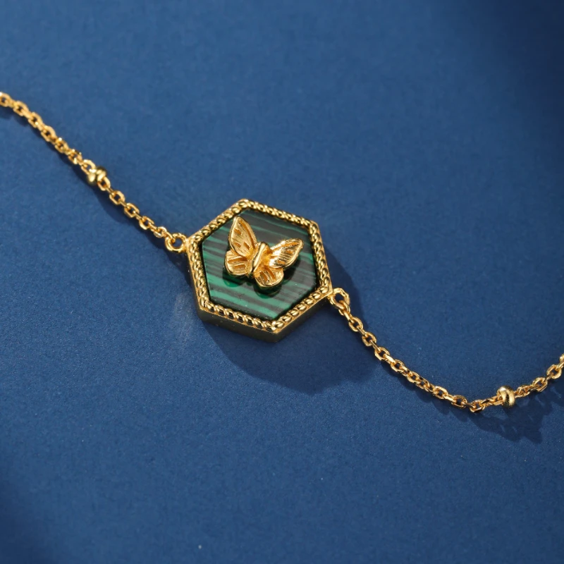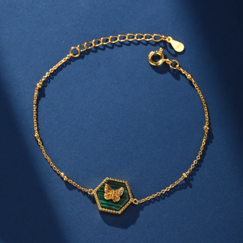 💎 Ajoutez une touche de grâce à votre poignet avec le Bracelet Malachite – Élégance Papillon, en argent plaqué or. Ce bracelet délicat et raffiné met en valeur une pierre de malachite ornée d’un papillon doré, symbolisant transformation et beauté.