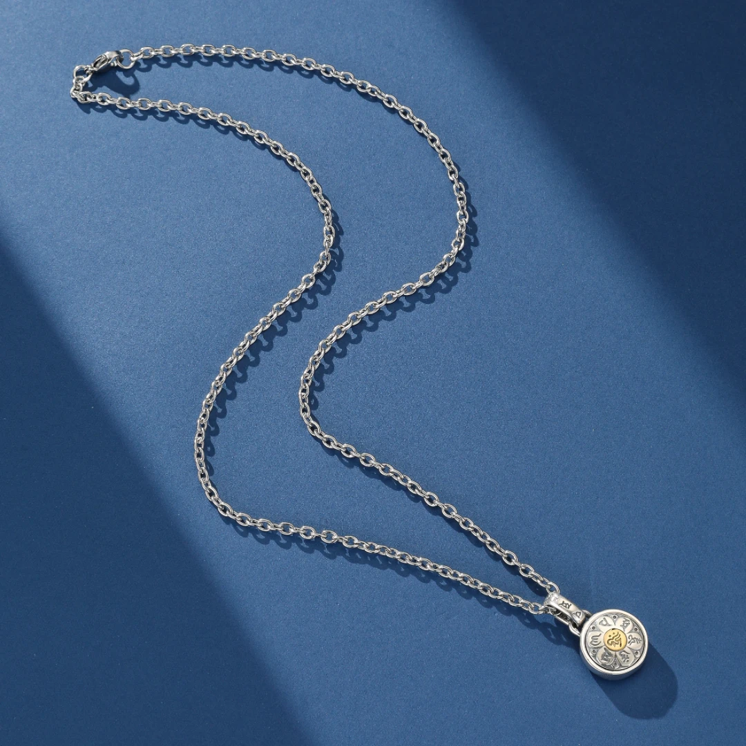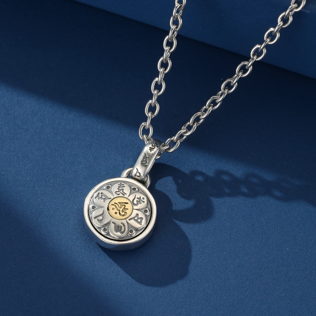 🌟 Portez la sagesse ancestrale avec ce collier orné des Six Mantras sacrés, symboles de protection et de paix intérieure. Conçu en argent 925, son pendentif circulaire présente une élégante gravure dorée en son centre, ajoutant une touche de raffinement et de spiritualité.