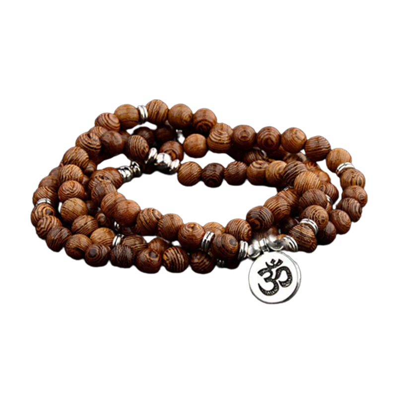 Le Mâlâ « Placide » en 108 Perles de Bois de Wengé est de couleur marron avec des zébrures de bois. Cet accessoire peut se porter comme bracelet et collier en vue de sa longueur. Au centre de ce mâlâ, vous trouverez un pendentif du symbole OM.