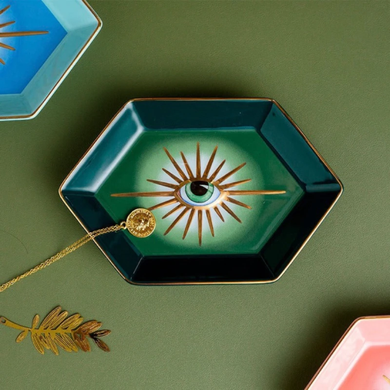 🔮 Fabriqué en céramique émaillée colorée, ce plateau de 16,6*11*2,5 cm est disponible en plusieurs couleurs vibrantes, chacune ornée d’un œil protecteur au centre. Le bord doré ajoute une touche de luxe, rendant chaque pièce unique et élégante. Idéal pour une utilisation décorative ou fonctionnelle.